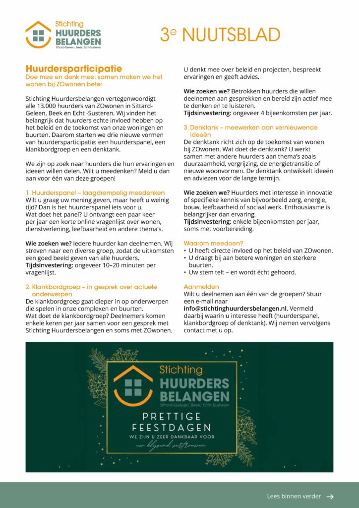 Hier vind je alle recente updates, aankondigingen en belangrijke informatie met betrekking tot onze Stichting en de huurdersbelangen die wij behartigen in Sittard-Geleen, Beek en Echt-Susteren. Of het nu gaat om nieuwe ontwikkelingen in de huursector, aankondigingen van evenementen of tips voor huurders, je vindt het hier allemaal. We houden je graag op de hoogte van alles wat speelt binnen onze gemeenschap en streven ernaar om transparantie en betrokkenheid te bevorderen.